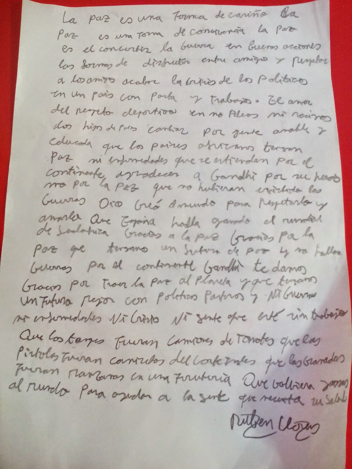 La paz es una forma de cariño, la paz es una forma de convivencia, la paz es el convertir la guerra en buenas acciones, la forma de disfrutar de amigos entre amigos, el respetar a los amigos, acabar con la crisis de los políticos en un país con pasta y trabajo. El amor del respeto deportivo, en no peleas y racismos. Que los hijos de puta los cambiemos por gente amable y educada. Que los paises africanos tengan paz y ni enfermedades que se extiendan por el continente. Agradecer a Gandhi por su heroismo por la paz. Que no hubieran existido las guerras. Dios creó al mundo para respetarlo y amarlo. Que España haya ganado el Mundial de Sudáfrica gracias a la paz.