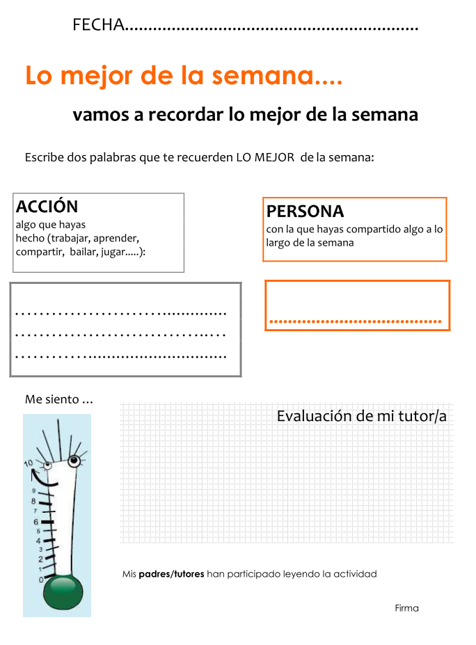 - Desarrollar el pensamiento positivo: actividad de inicio y final de semana donde se recoge una acción y persona identificada con un pensamiento positivo “lo mejor”.